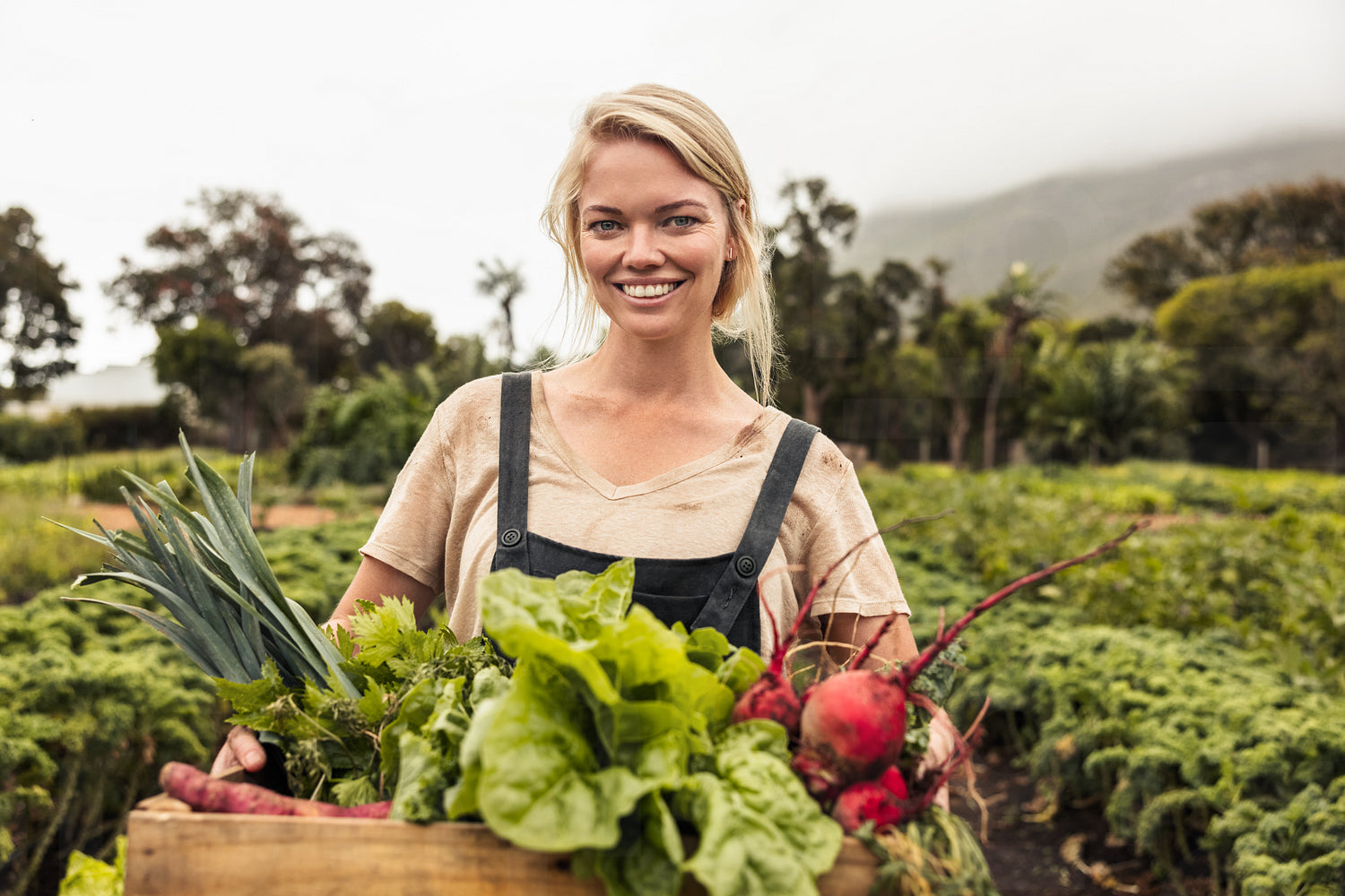 Vegetable farmer smiling cheerfully after harvest