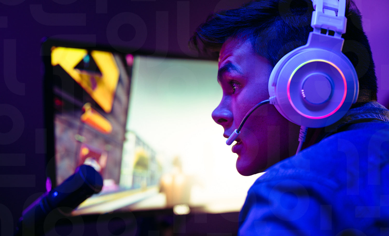 With a computer in front of him, a video game player live streams his gameplay. With his headset and microphone, he enters into the world of online video games, engaging with a community of players and streamers.