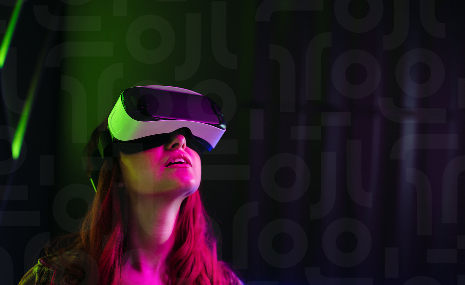 Young woman looking at the immersive digital environment around her with a VR headset. Woman exploring virtual reality and the simulated world created by the futuristic technology.