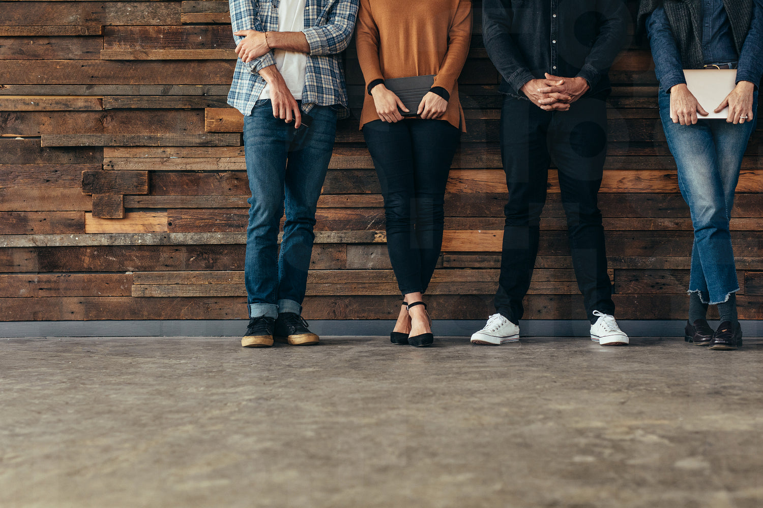 Low section of people leaning against the wall before a job interview with folders in hands in the waiting room. People standing in row waiting for job interview.