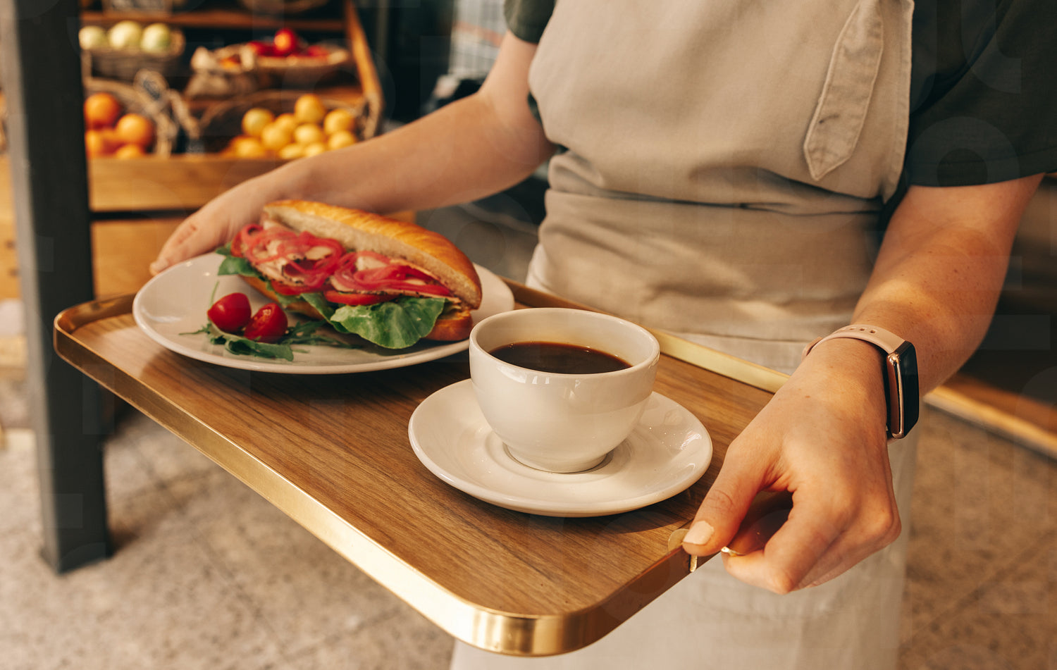 Unrecognizable young waitress carrying a tray with a sandwich and a cup of coffee. Young woman working as a server in a fast food restaurant.