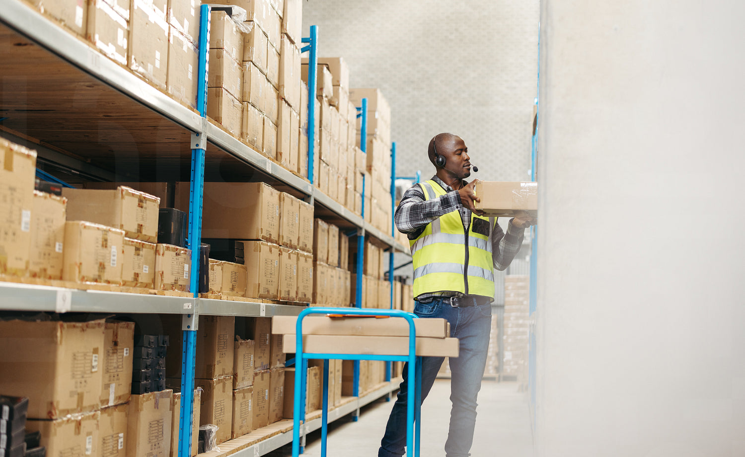 Logistics worker pulling a flat box from a shelf while wearing a headset. Warehouse employee fulfilling orders with instructions from a warehouse management system in a distribution centre.
