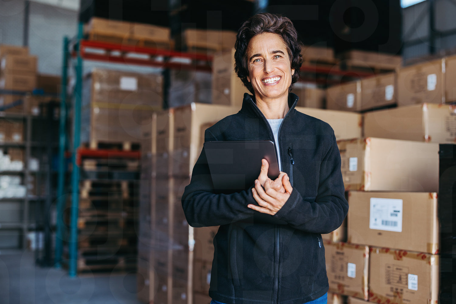 Portrait of a warehouse supervisor smiling at the camera while holding a digital tablet in her hand. Happy mature woman working with warehouse management software in a distribution centre.
