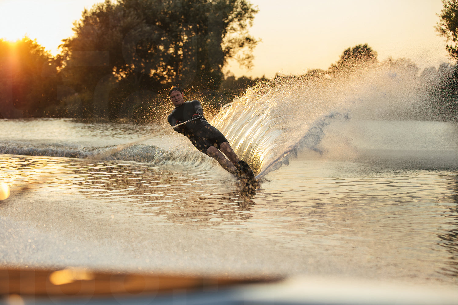 Man riding wakeboard in a lake. Water skier in action on the lake.