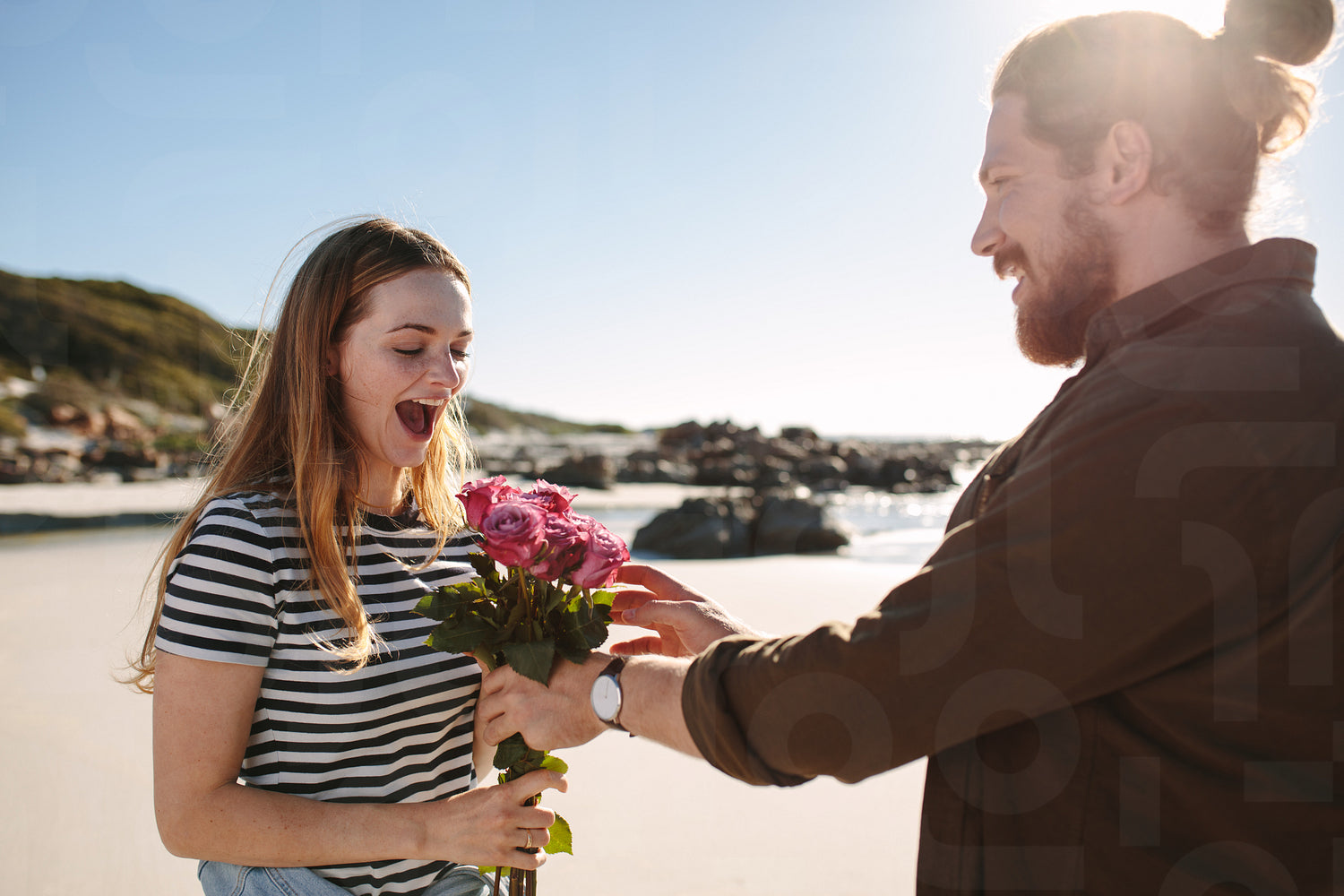 Boyfriend surprising girlfriend with flowers on the beach. Man surprising woman with bunch of roses on a romantic date.