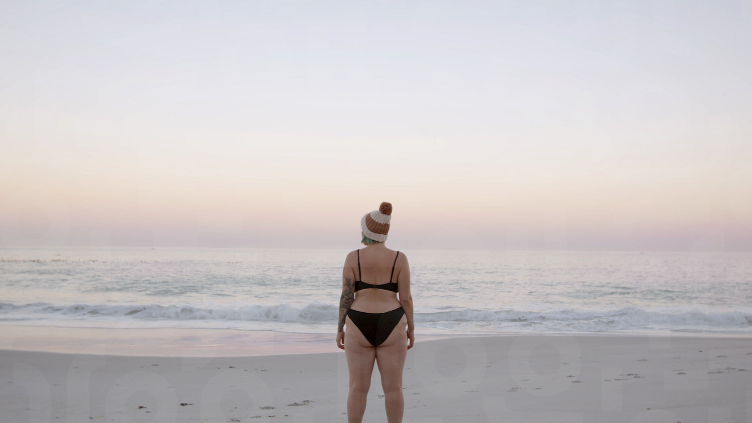 Rear view of mid adult female in swimsuit and wooly hat at beach during sunset. Woman in swimsuit standing on the seashore and looking at the sea.