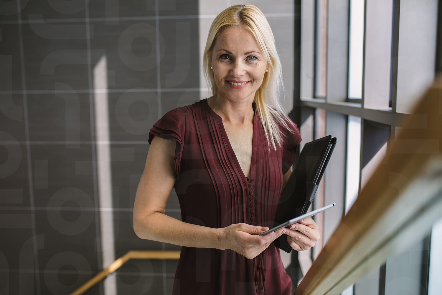 Portrait of woman walking up the stairs in the office with a digital tablet. Female executive at work in modern office.