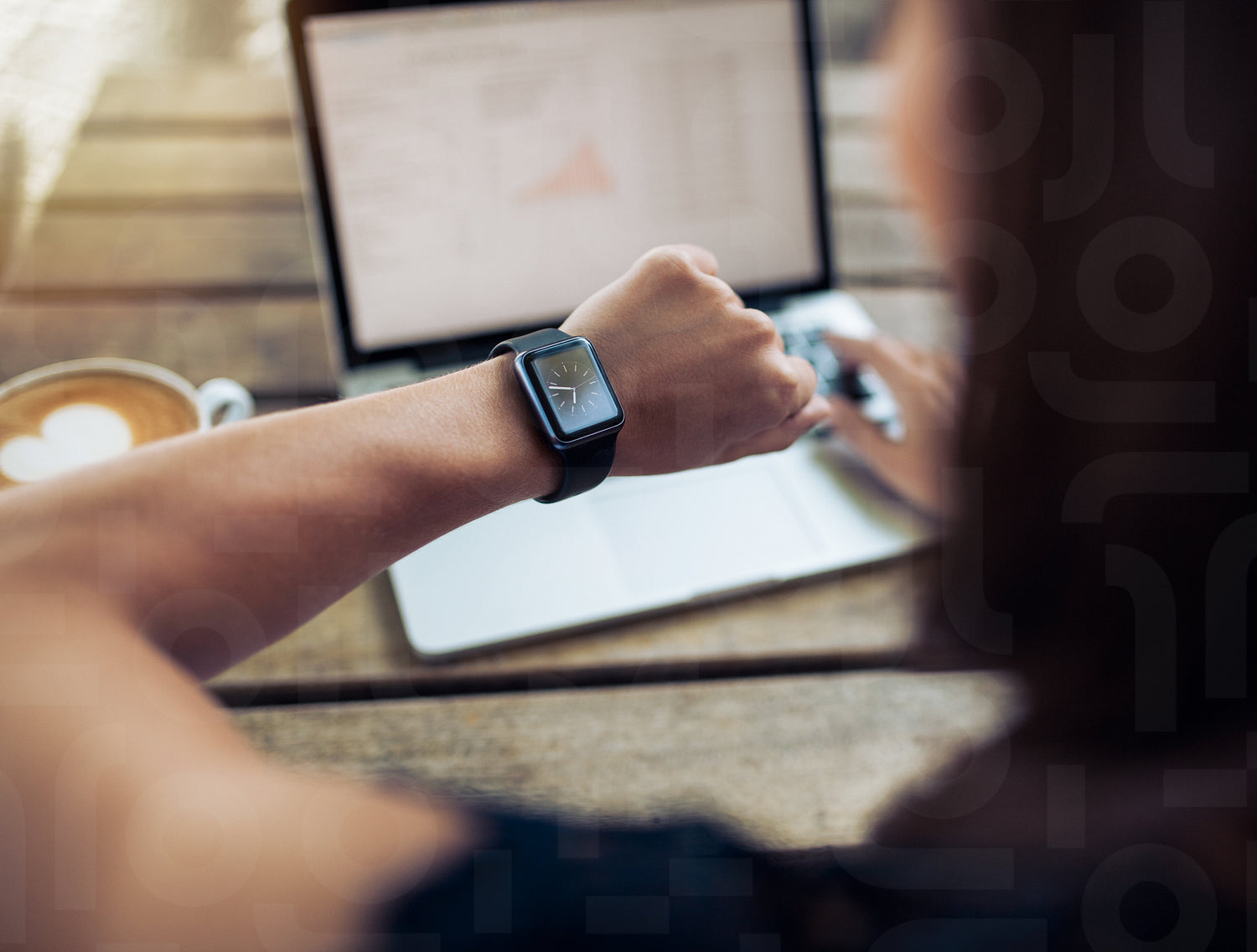 Close up shot of a woman checking time on her smartwatch. Female sitting in cafe with a laptop and cup of coffee.