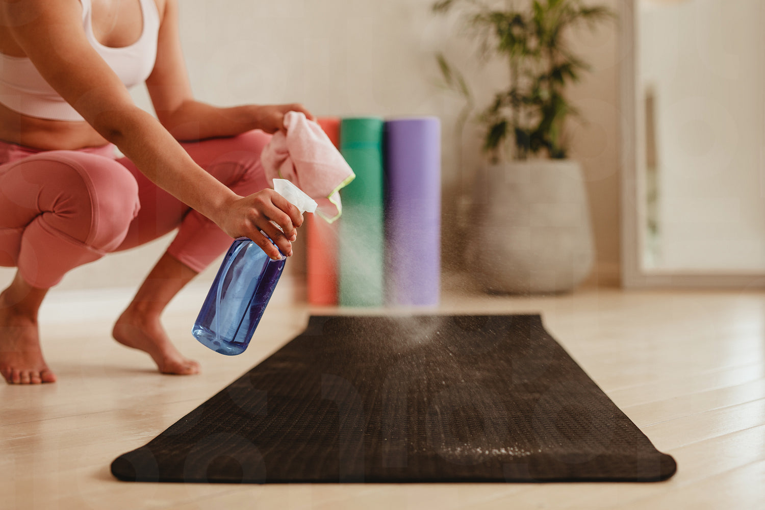 Woman cleaning exercise mat with disinfectant spray in gym. Female sanitizing fitness mat with disinfectant spray at home.