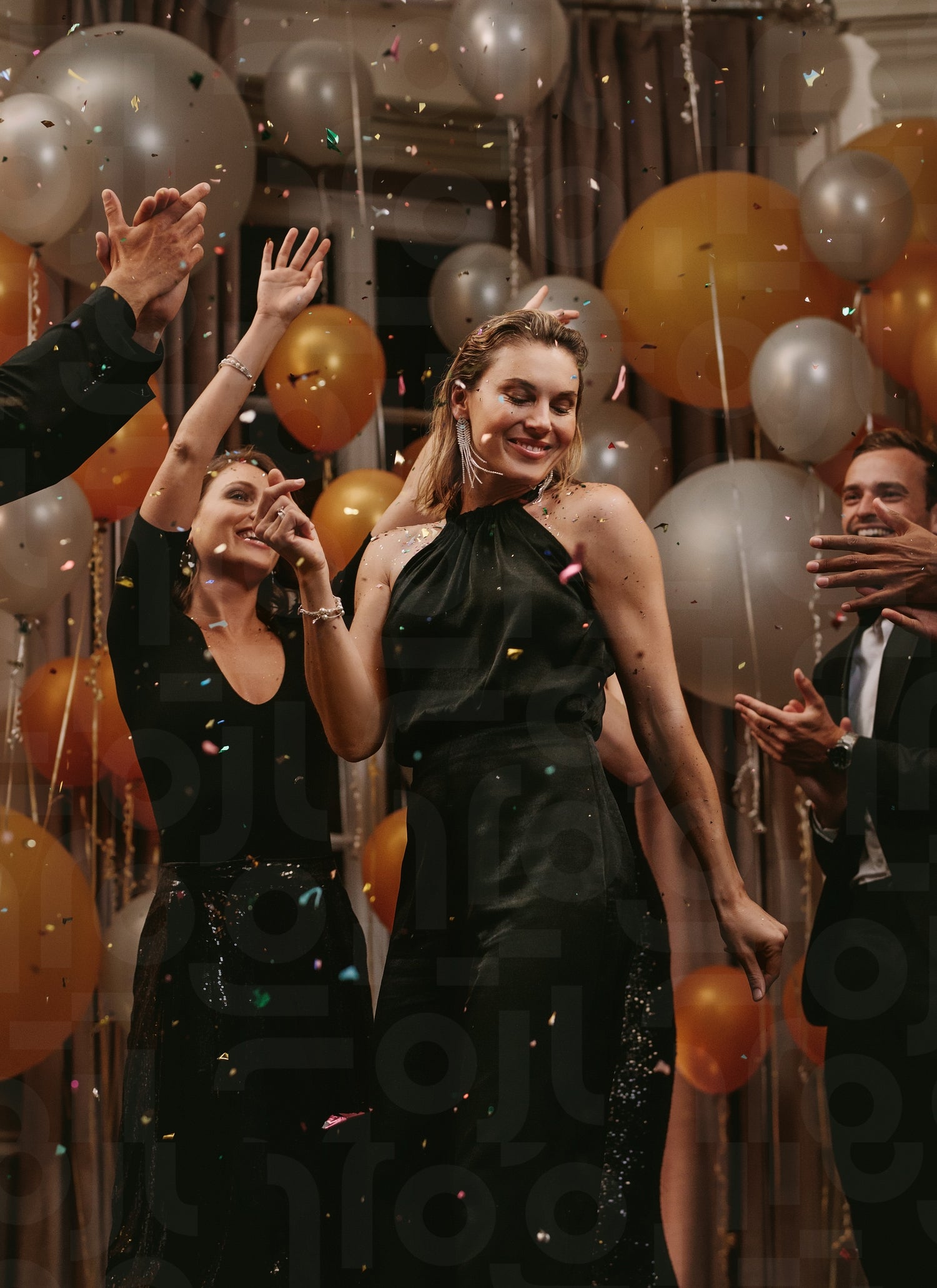 Attractive woman dancing at gala night with friends around. Group of multi-ethnic friends having a great time dancing at a new years party.