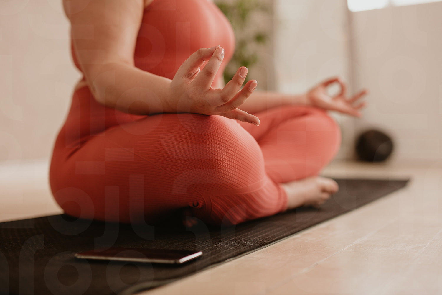 Female sitting on fitness mat with legs crossed and hands on knees in yoga pose. Woman meditating in lotus pose at gym.