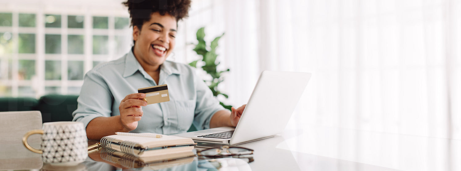 Wide angle shot of female sitting at desk doing online shopping on laptop. Cropped shot of woman using credit card for ecommerce shopping.
