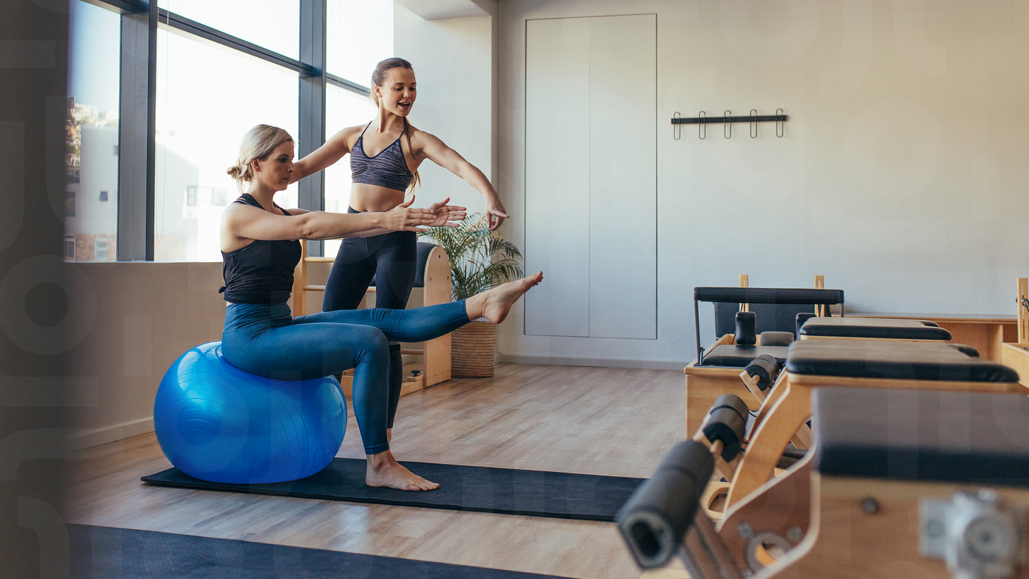 Fitness woman doing pilates workout sitting on an exercise ball at gym. Fitness trainer guiding a woman in pilates training.