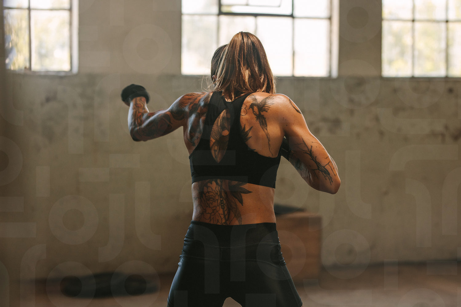 Woman in sportswear practicing shadow boxing at a fitness space inside abandoned warehouse. Tattooed female athlete doing shadow boxing workout inside old warehouse.