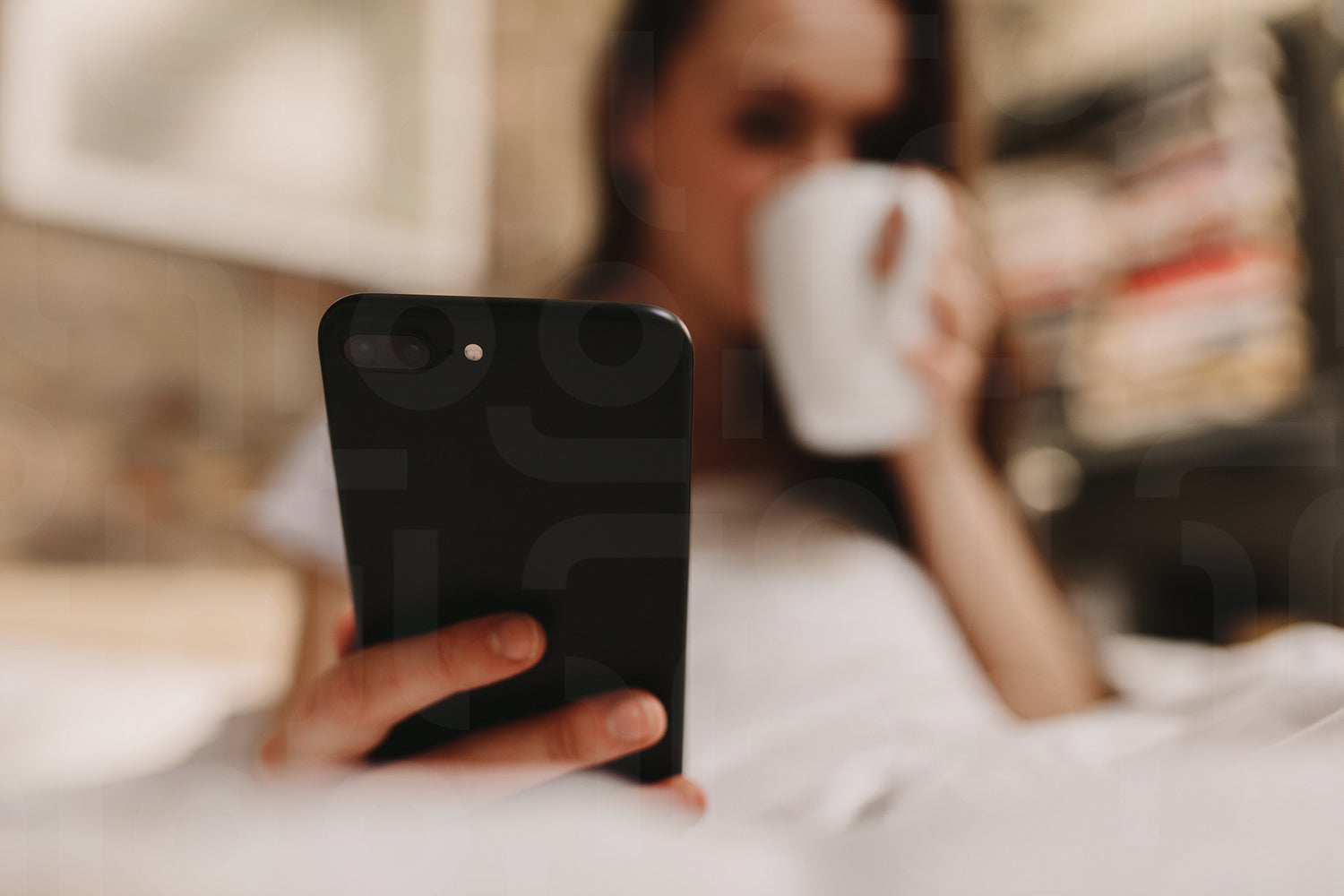 Woman looking at her mobile phone while having bed coffee. Woman sitting on bed with a cup of coffee holding a mobile phone in hand.