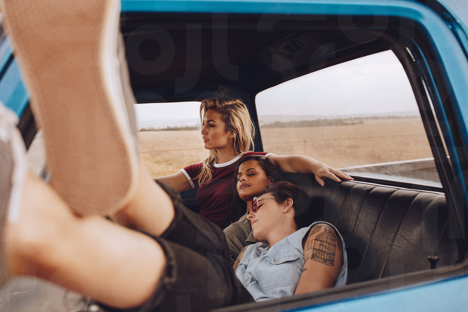 Two women sleeping in car with a friend driving. Women going a on long drive in a car. Road trip in countryside.