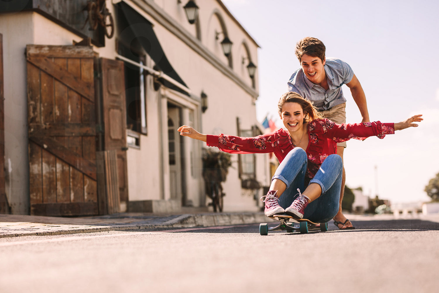 Smiling woman sitting on a skateboard sliding down an empty street. Man helping his girlfriend ride on a skateboard pushing her from behind.