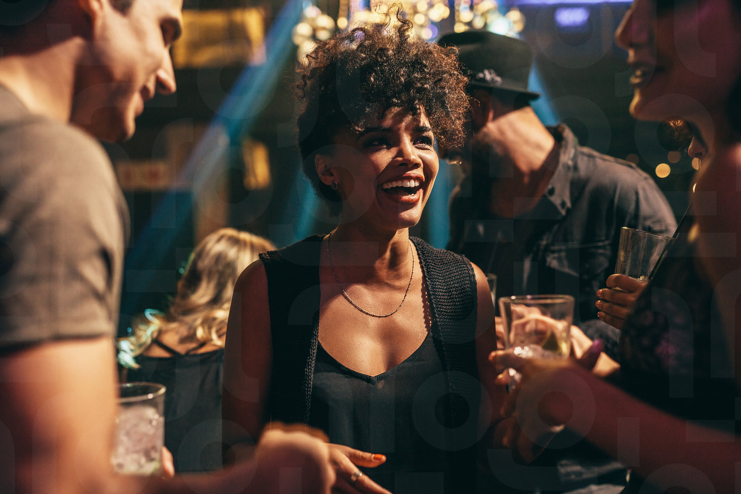 Shot of young african woman enjoying at nightclub with friends. Group of people having good time at pub.
