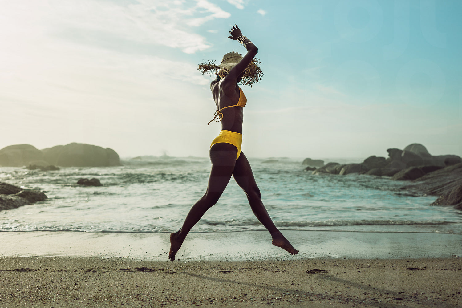 Full length of african woman in bikini running on the beach. Female model on the sea shore enjoying herself.