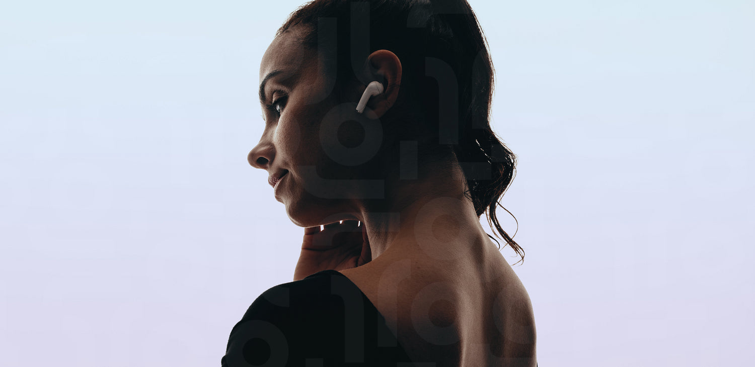 Woman enjoying peaceful moment with wireless earphones and a relaxing music playlist