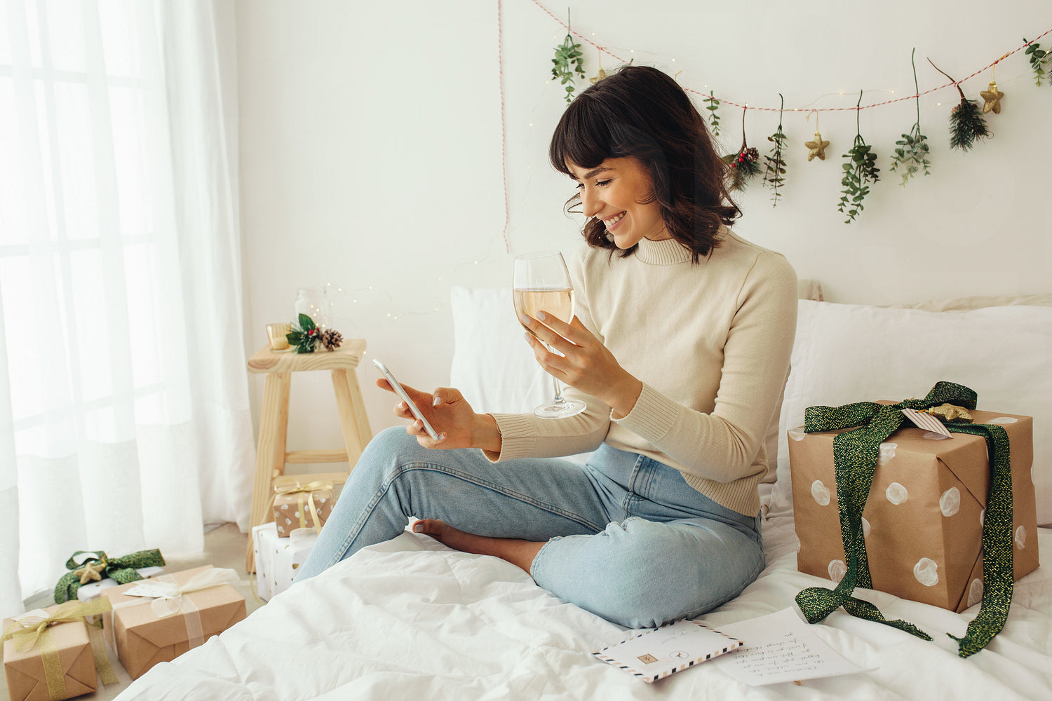 Woman sitting on bed with a wine glass looking at mobile phone. Woman sitting at home decorated for christmas.