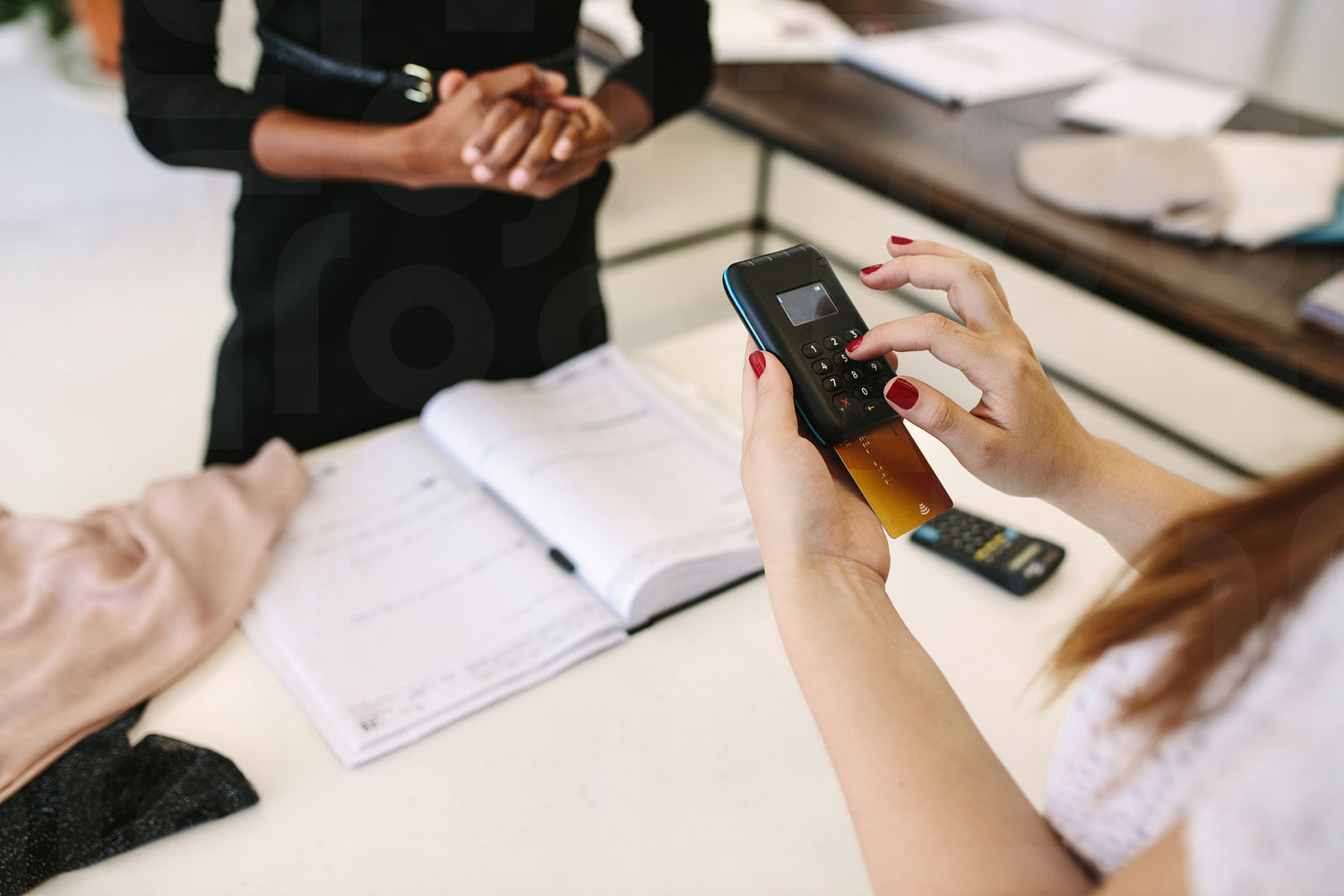 Customer shopping designer wear at a fashion boutique. Cropped shot of customer making payment by entering her pin in point of sale machine.