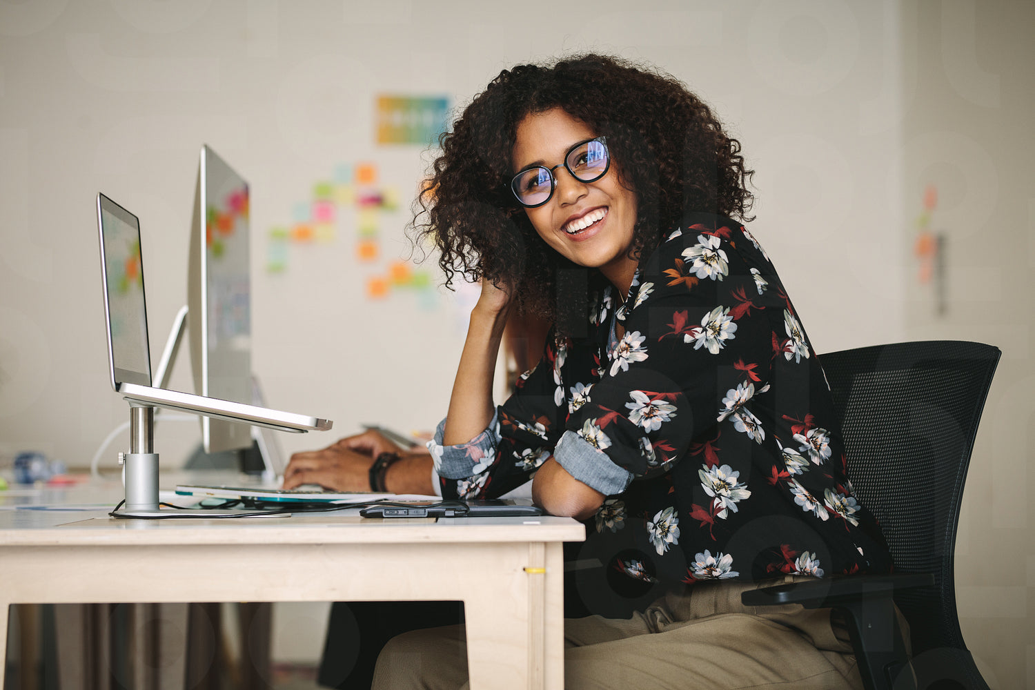 Smiling businesswoman sitting at her desk in office with a laptop mounted on a stand. Woman wearing eyeglasses working on laptop sitting in office.