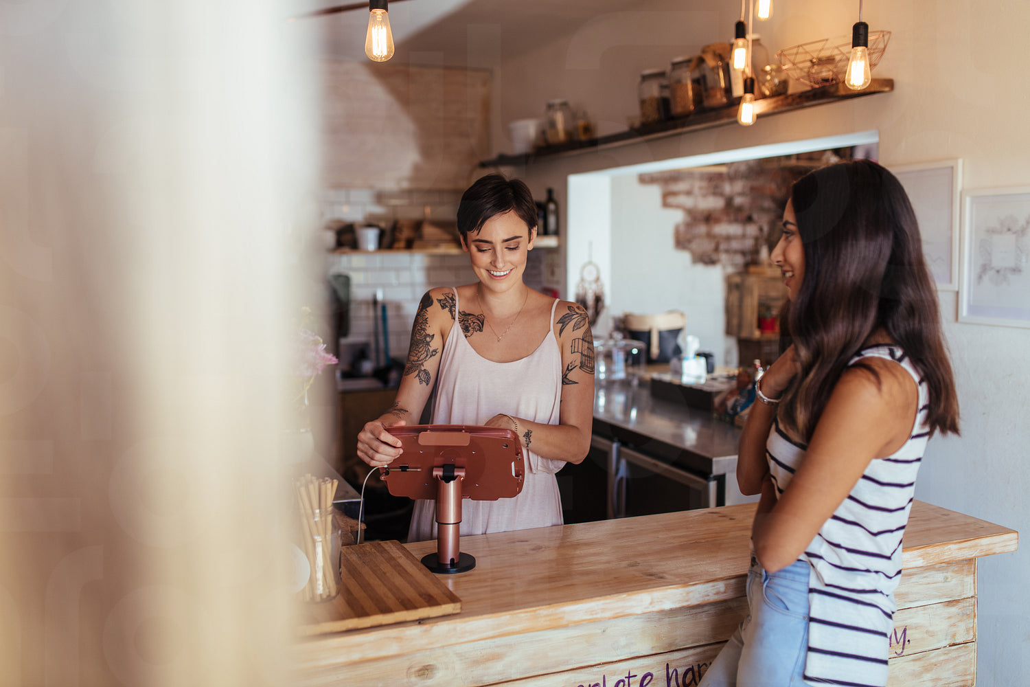 Woman standing at the billing counter of her cafe accepting orders. Woman ordering food across the counter at a restaurant.