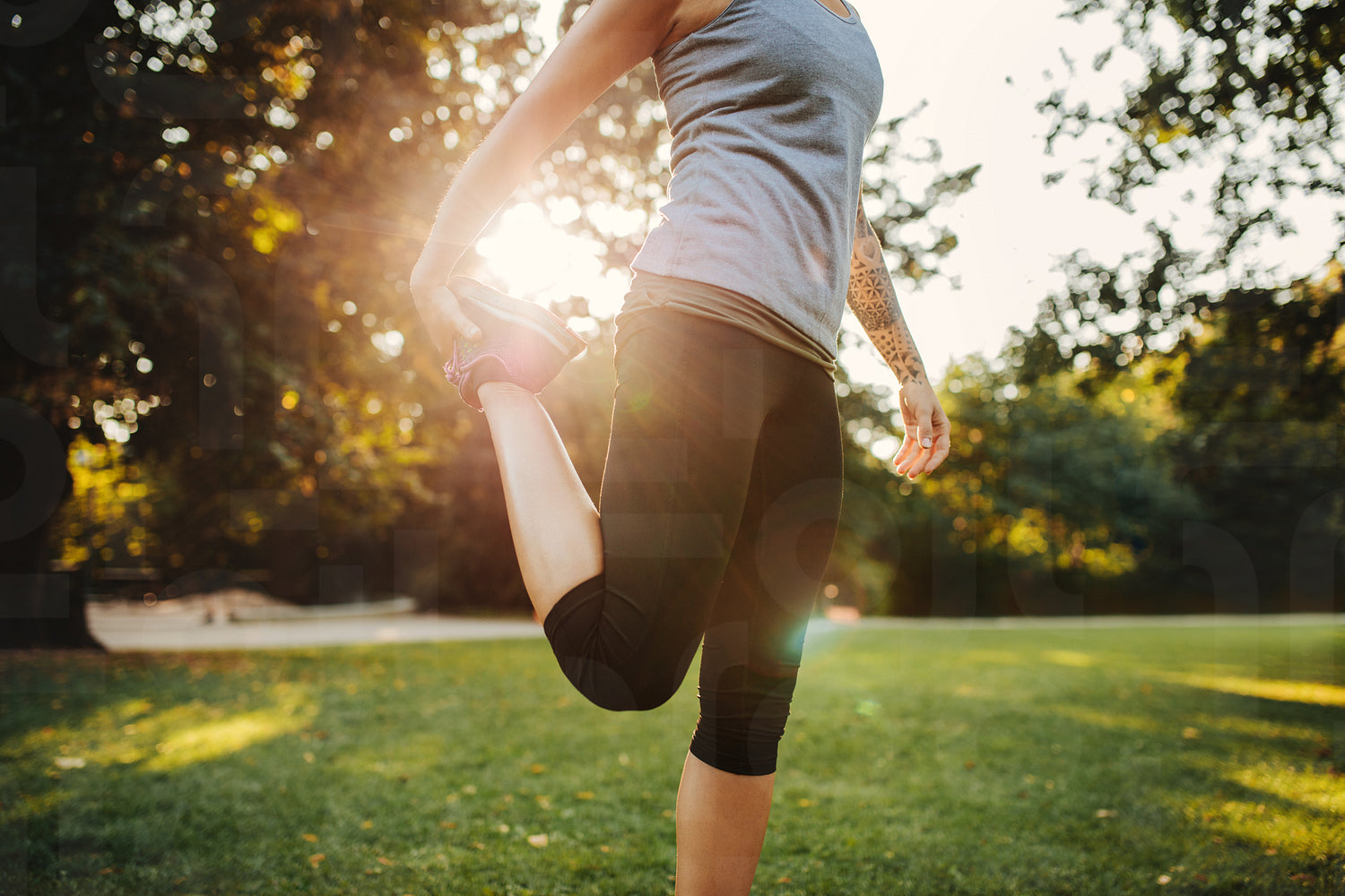 Cropped shot of fit young woman stretching legs in the park. Female exercising in the morning at city park.