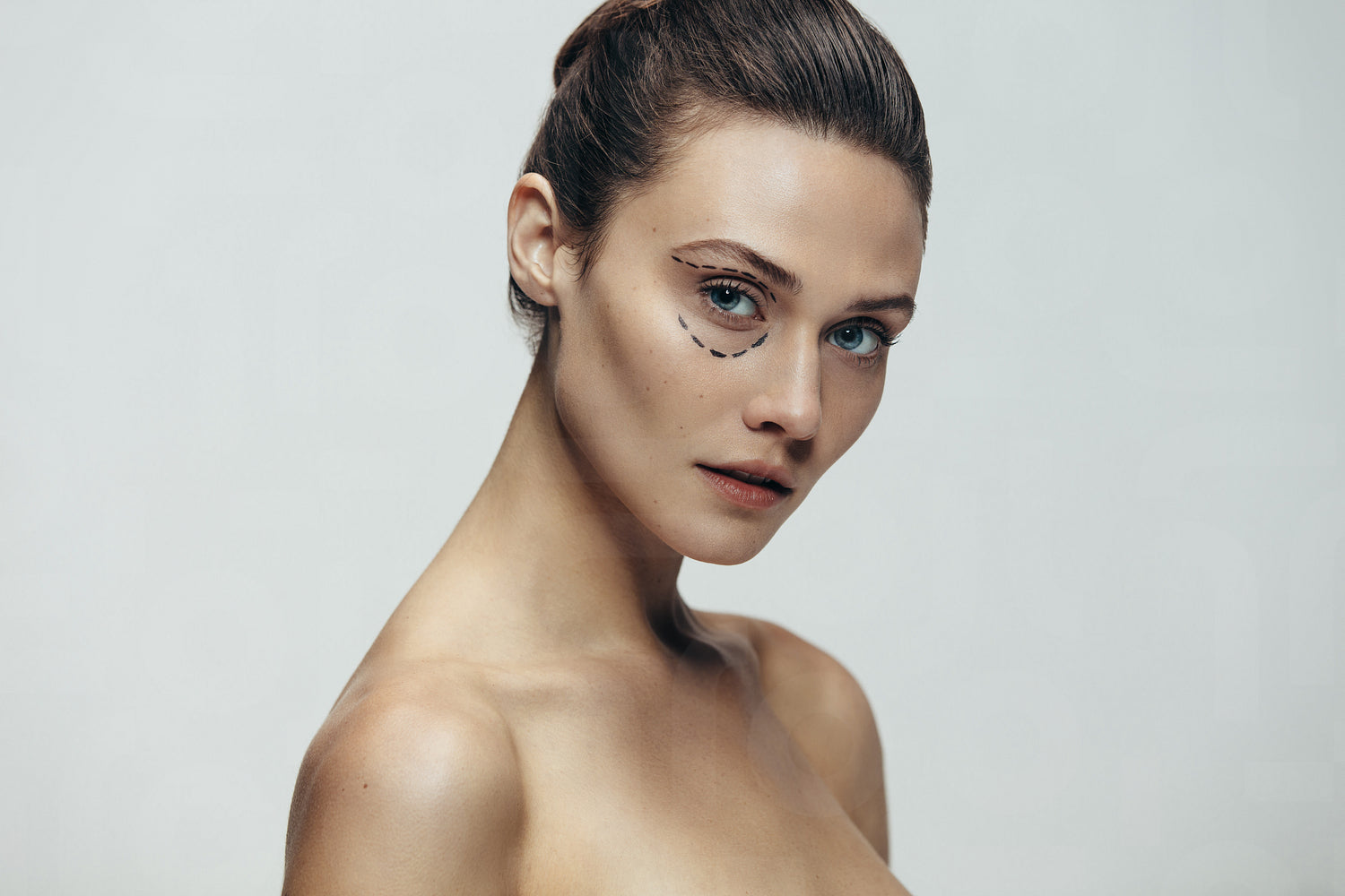 Portrait of beautiful young woman with dotted lines around eyes. Female having facial cosmetic surgery. Woman looking at camera against grey background.