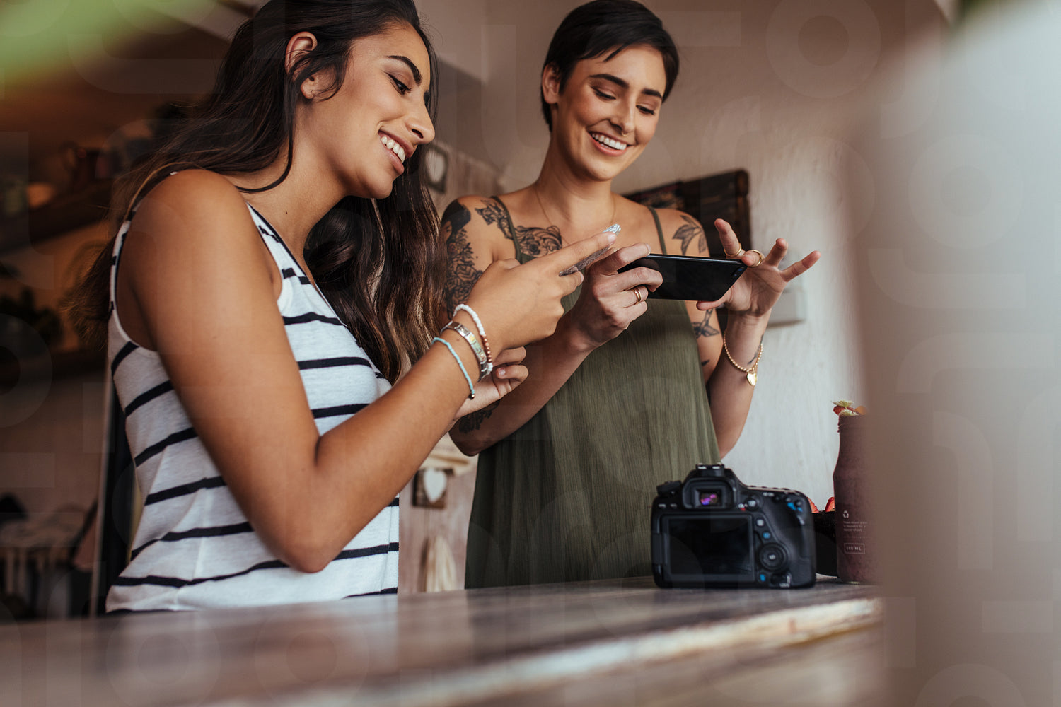 Women bloggers shooting photos of smoothie jar placed beside a DSLR camera for an article on food blog. Food bloggers taking photos for their food blog using mobile phones.