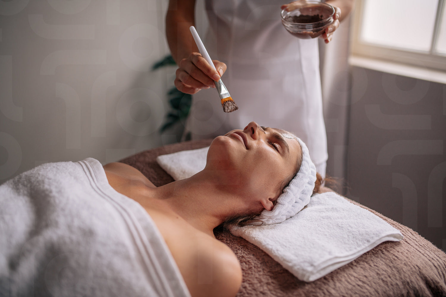 Beautiful young woman lying on massage table while facial mask is applied on her face by beautician in spa. Woman having facial mask at beauty salon.