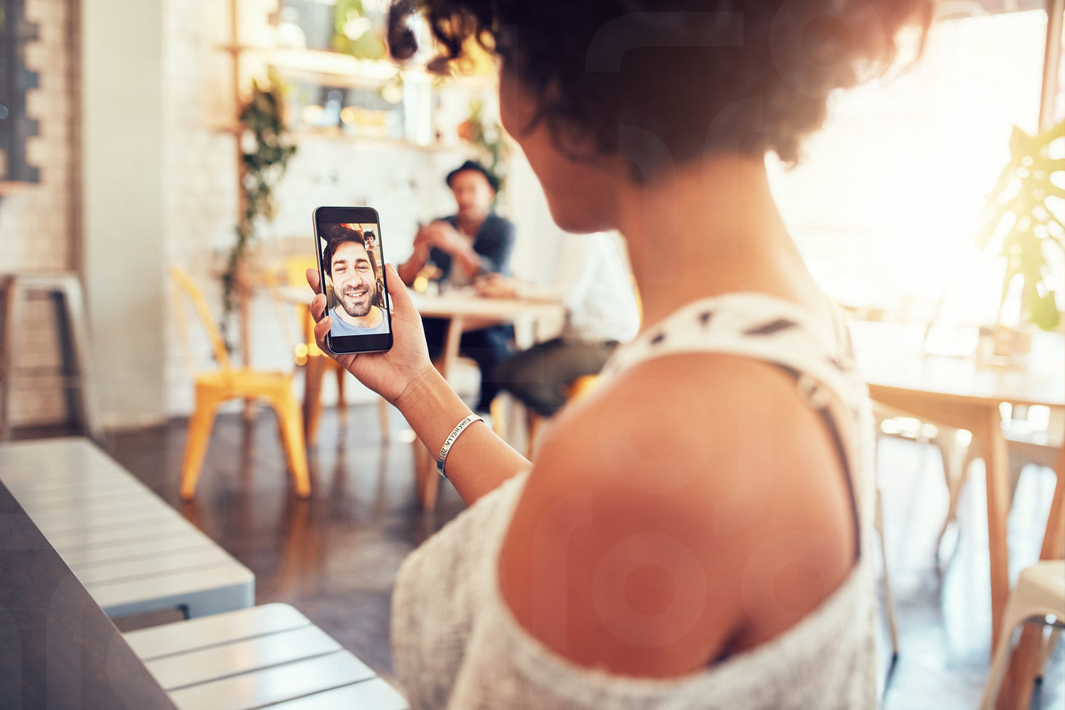 Man and woman talking to each other through a video call on a smartphone. Young woman having a videochat with man on mobile phone. Woman sitting at a cafe.