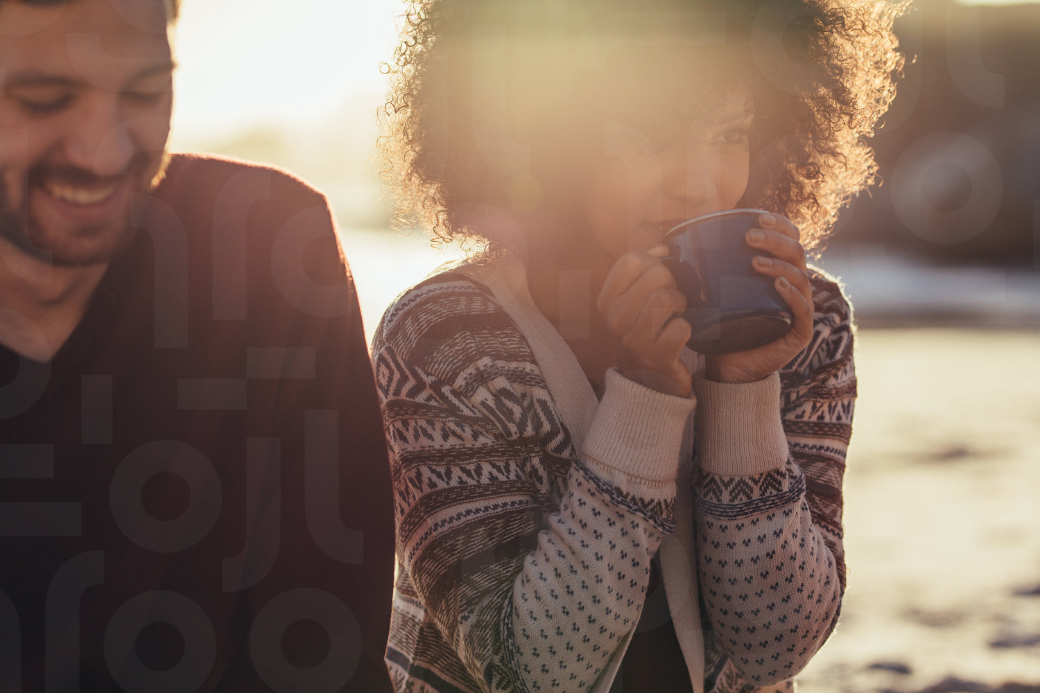 Woman drinking coffee while sitting with male friend at the beach. Young friends relaxing at the sea shore during sunset.