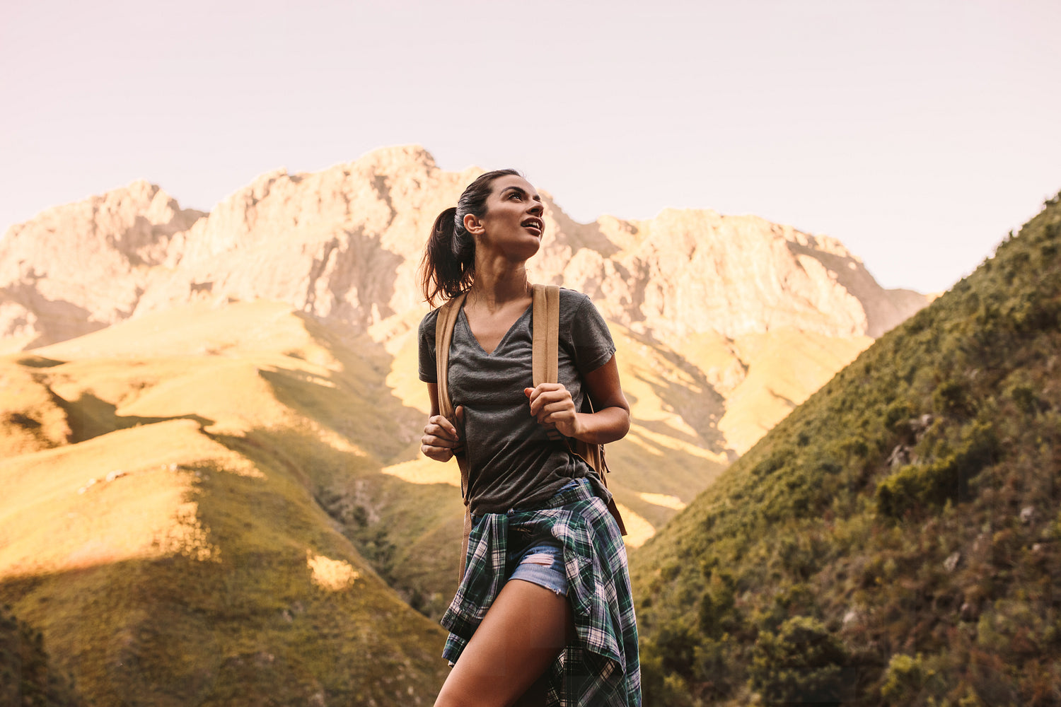 Woman hiking in mountains and looking at the landscape. Female hiker looking at the scenic view during a hike.