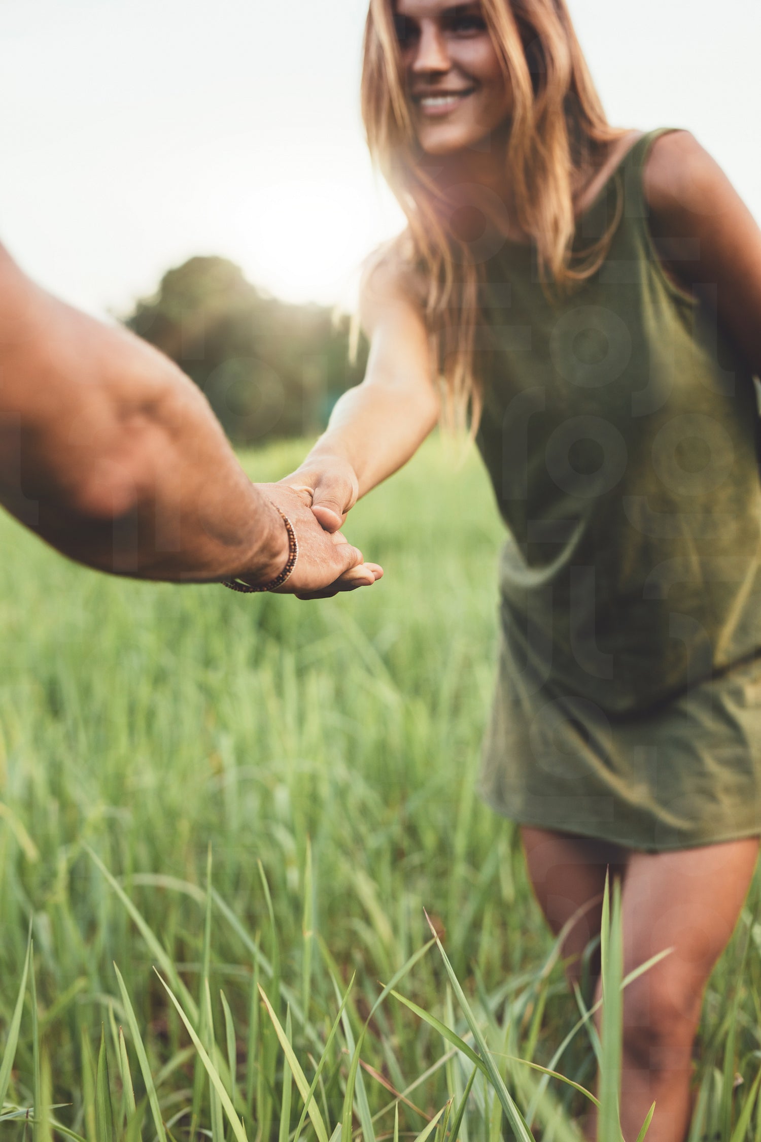 Shot of woman holding hand of her boyfriend and standing in grass field. Loving young couple on meadow outdoors.
