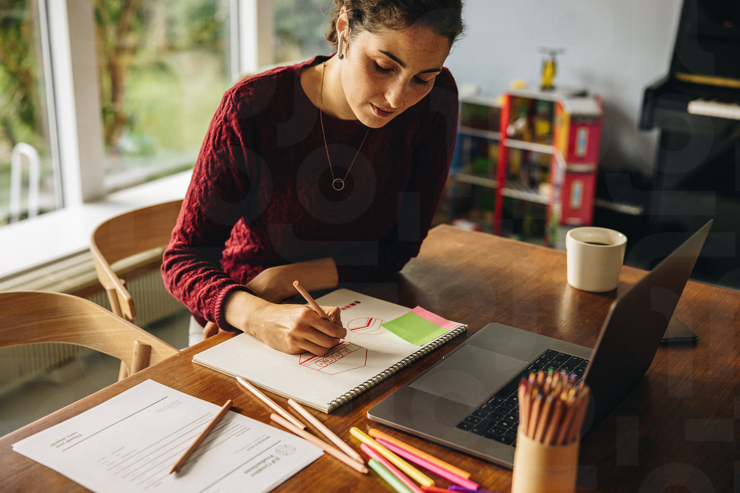 Beautiful woman illustrator drawing on paper. Female artist sitting at table with laptop making some illustrations with color pen at home.