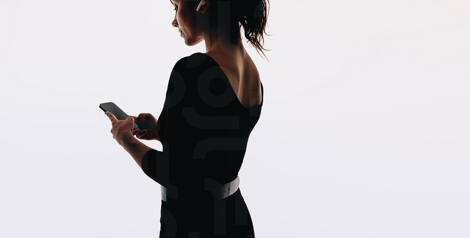 Woman in a leotard outfit listens using a smartphone with earbuds on