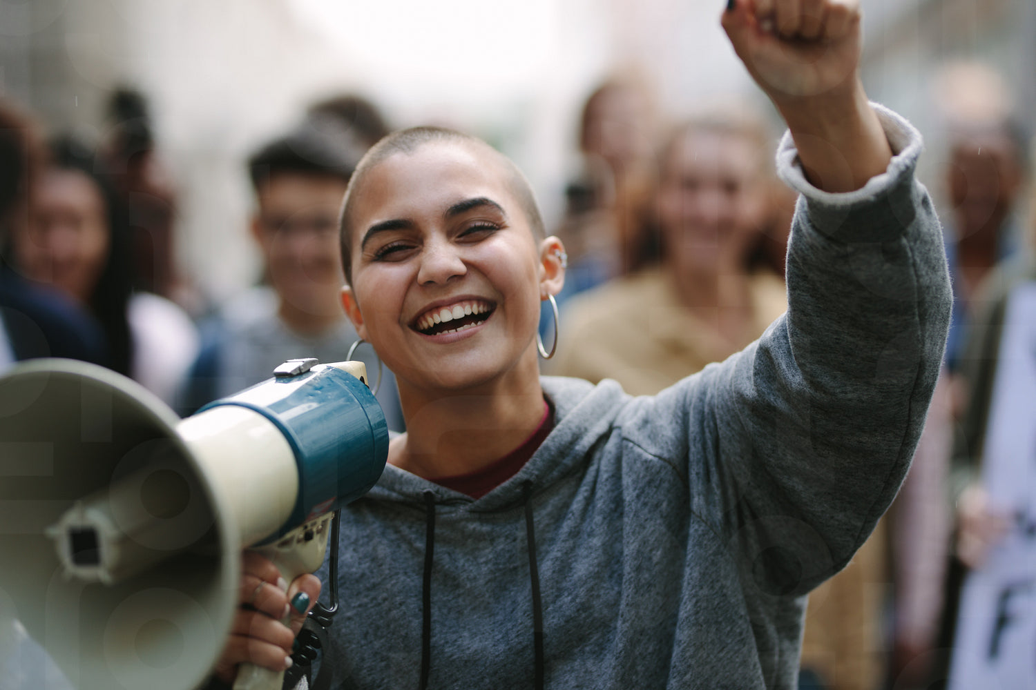 Smiling woman protesting with a bullhorn on the street with people in background. Female with a megaphone as she participates in a street demonstration.