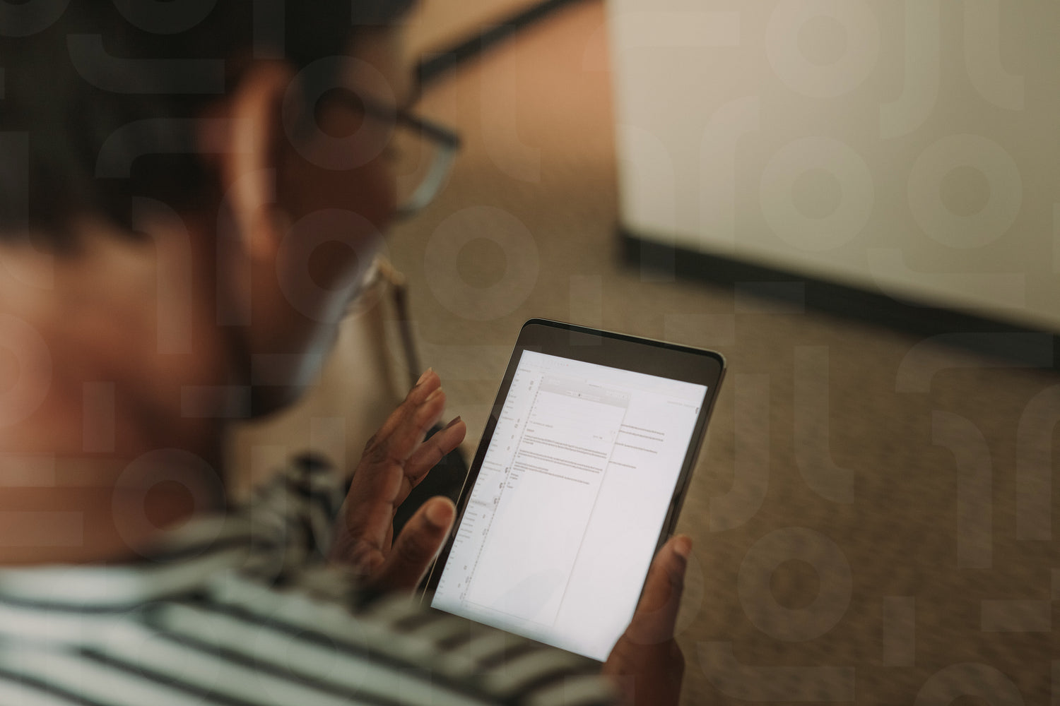 Woman in hotel room using digital tablet to check her emails. Focus on tablet computer in hand of businesswoman.