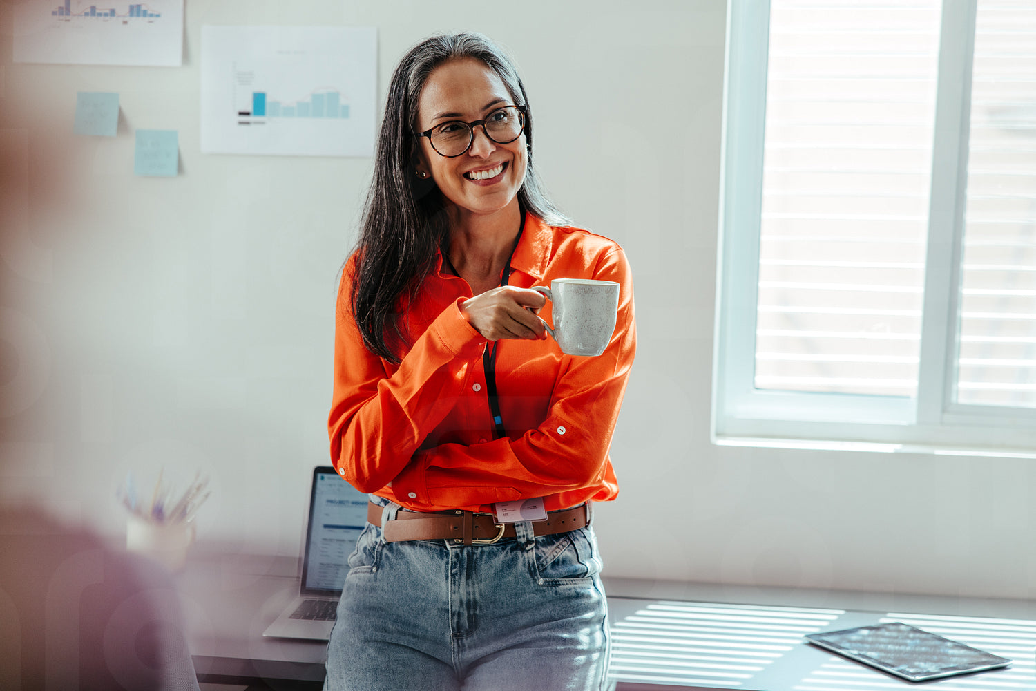 Woman in orange shirt holding coffee cup and smiling in a bright office environment