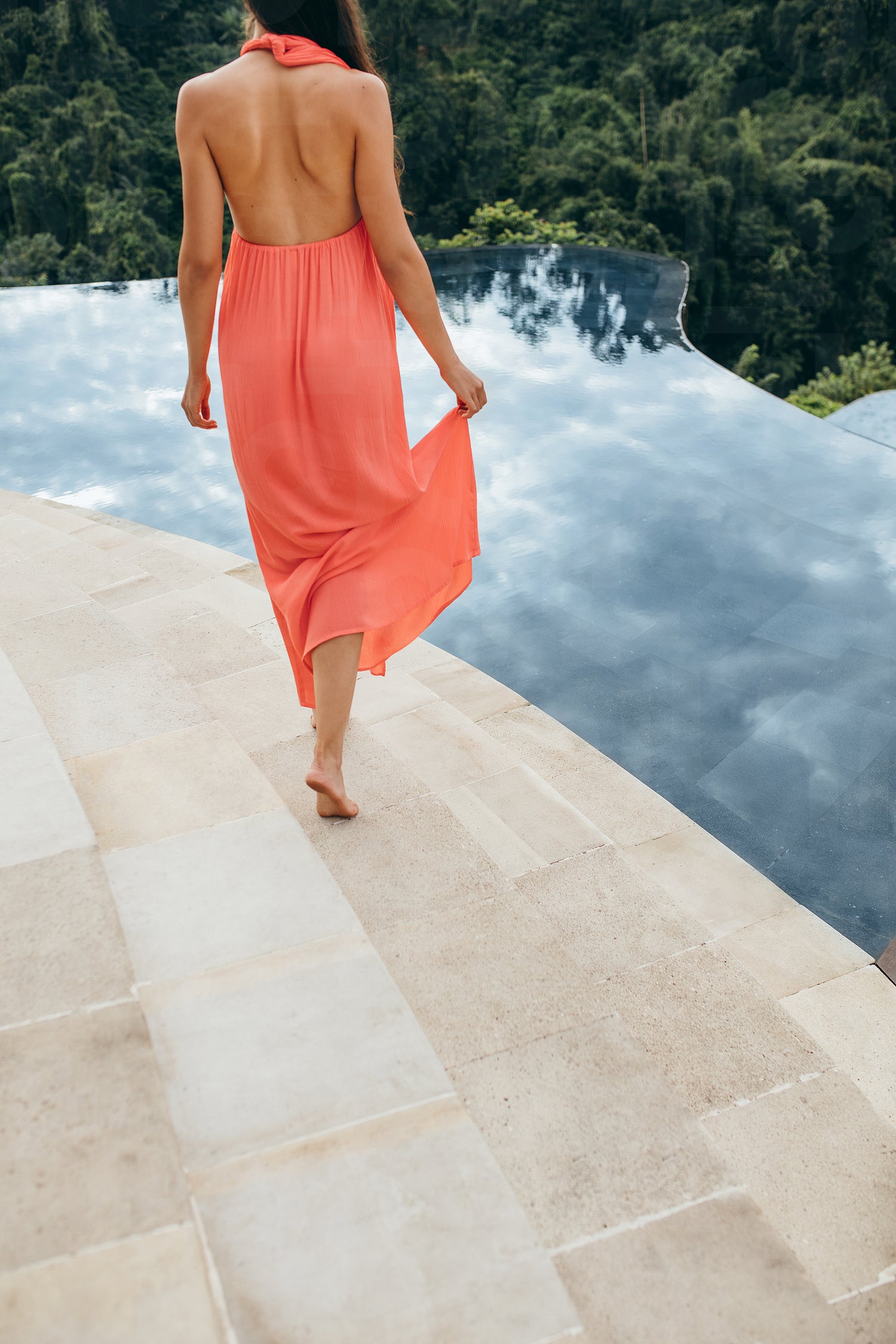 Rear view shot of young woman in orange sundress walking along swimming pool. Female model at poolside.