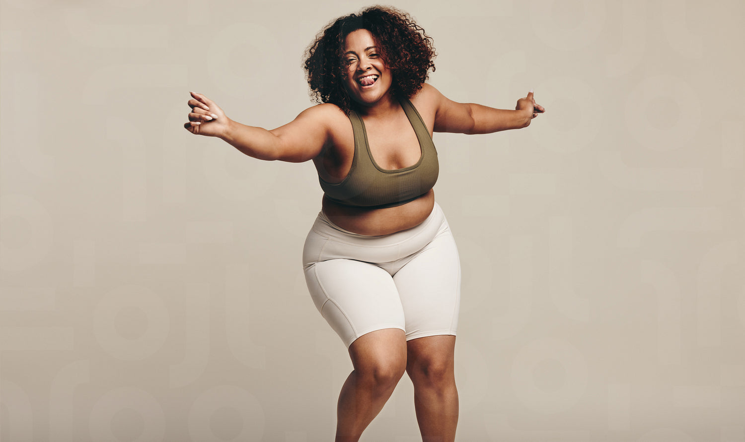 Woman dancing in a studio, moving her body with a happy smile as she finds her rhythm. Woman expressing confidence in her effortless body movements, enjoying the fun that comes with letting loose.