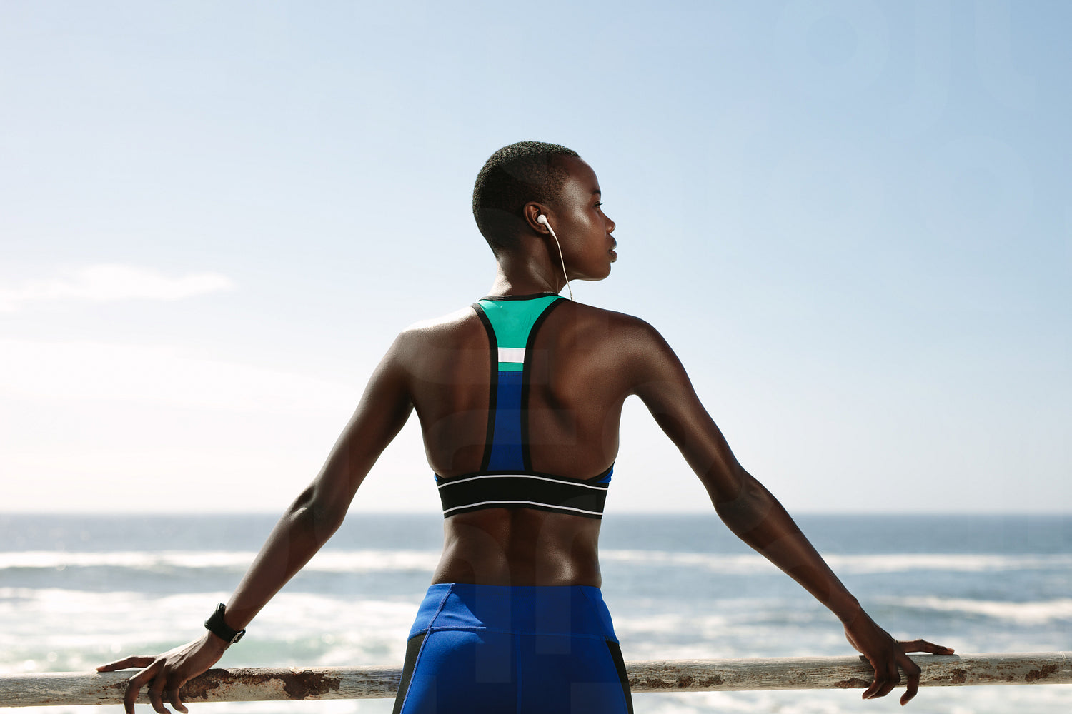 Rear view of a fitness woman standing at the road by the beach. Woman in sportswear relaxing outdoors after workout.