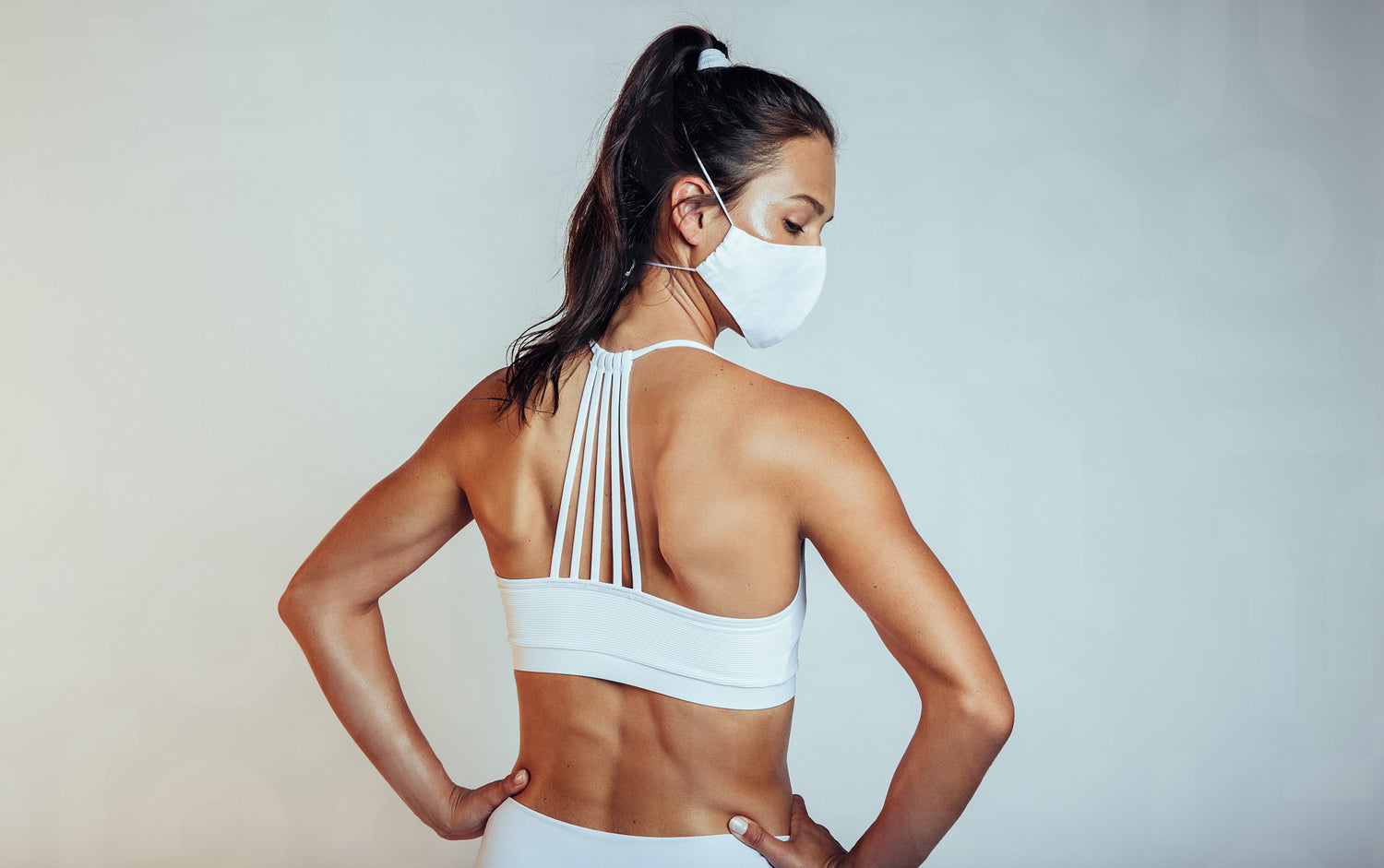 Rear view of a woman in sportswear with protective face mask against white background. Woman in white sports clothing standing with her hands on hips.