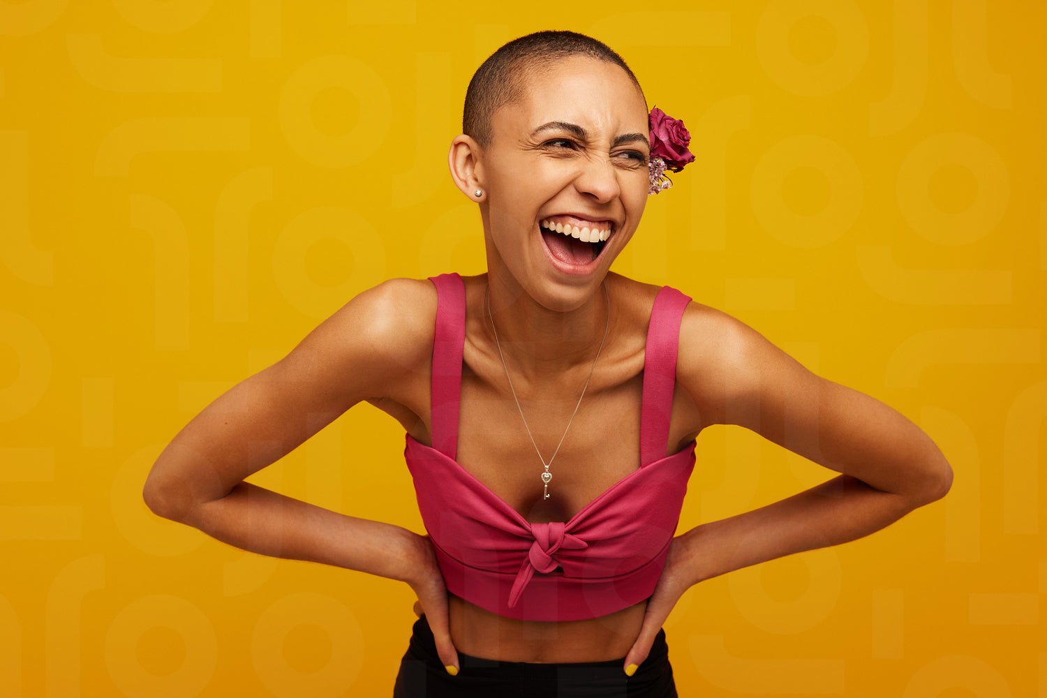 Woman in stylish outfit on yellow background. Model standing with hands on waist looking away and laughing.