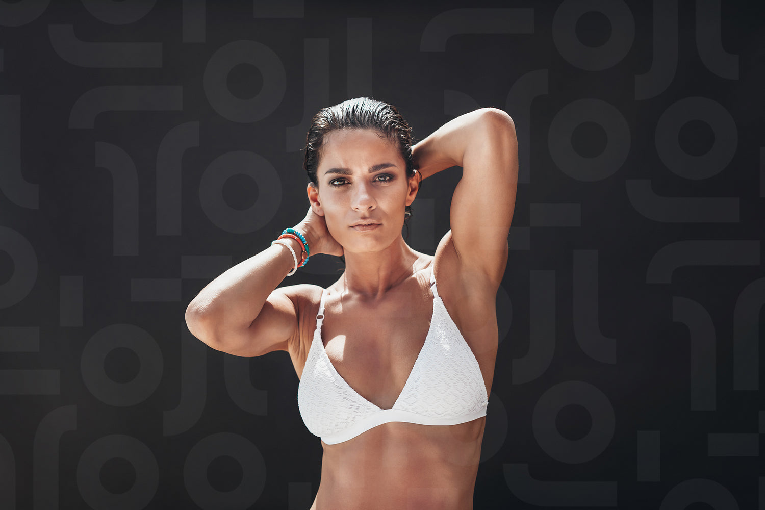 Portrait of young woman in white bikini posing on black background. Beautiful young female model in white swimwear looking at camera with her hands in hair.