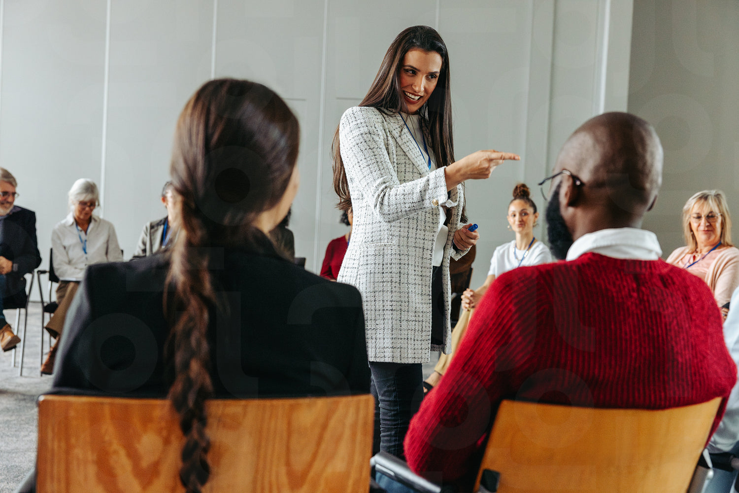 Woman leading a group discussion with diverse participants seated in a meeting room, fostering engagement and communication.
