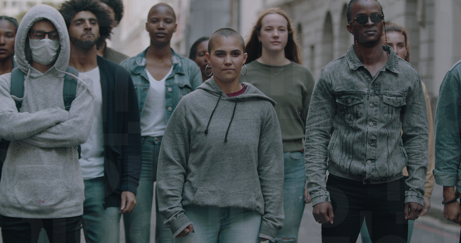 Woman leading a group of activists and giving slogans. Young men and woman protesting for protection of their civil rights.