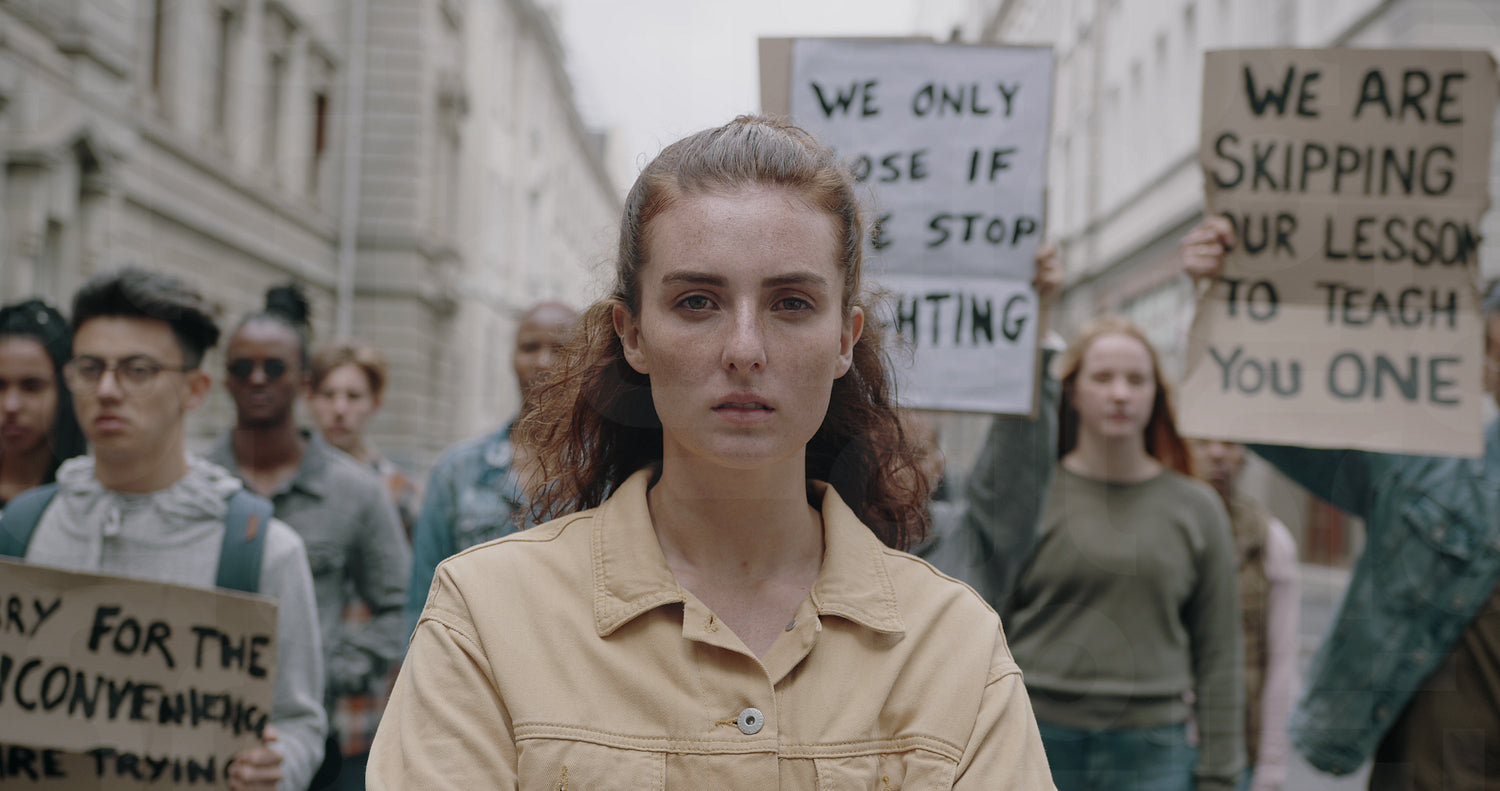 Woman leading the protest with a group in background. Nonviolent demonstration over global warming and pollution in the city.